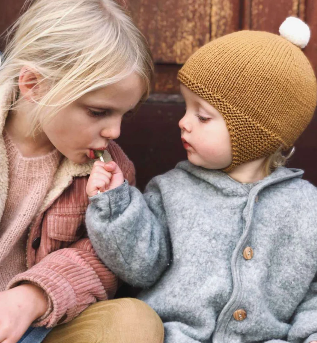 Materials: 50 (50) 50 (50) g Sunday by Sandnes Garn (50 g = 235 m [257 yds]) (held double) or Anina by Filcolana (50 g = 210 m [230 yds]) (held double). Some leftover yarn in a contrasting colour for the pompom. 1 button (Ø = 12 mm)